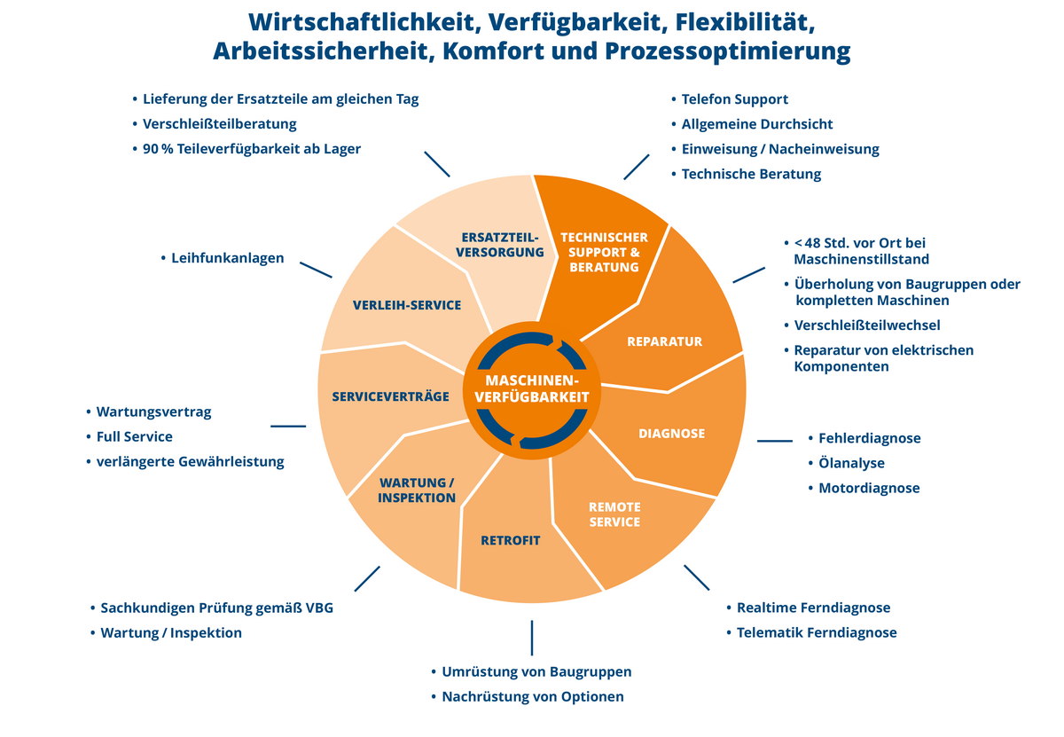 Mit zusätzlichen Vertragsvereinbarungen finden wir für jeden Betrieb eine maßgeschneiderte Lösung, ganz gleich ob für mobile Technik oder für stationäre Anlagen. Unsere bestens ausgebildeten Servicetechniker leisten mit ihren auf dem neuesten Stand ausgestatteten Service-Fahrzeugen kompetente und schnelle Unterstützung. So helfen wir Ihnen dabei,